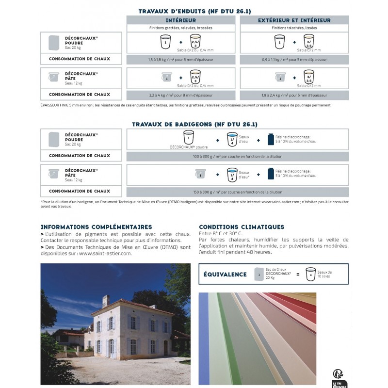 Sélectionnée par St Astier pour son extrême finesse, et sa blancheur très élevé, le Décorchaux chaux poudre ou pâte est une chaux aérienne éteinte pour le bâtiment ou chaux calcique.